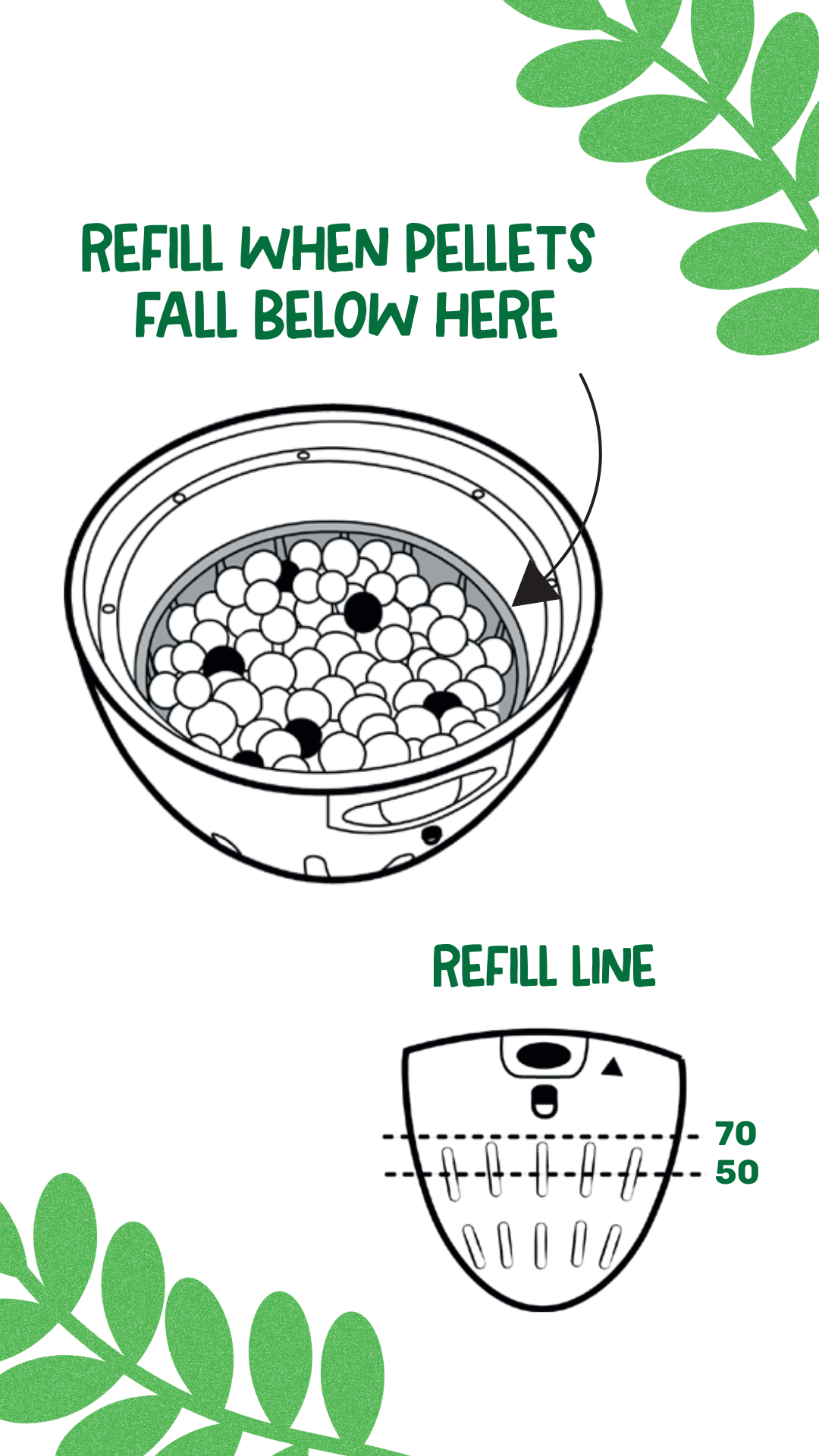 For 50 wash pellets, refill when the pellets drop below the indentation located between the top vents.